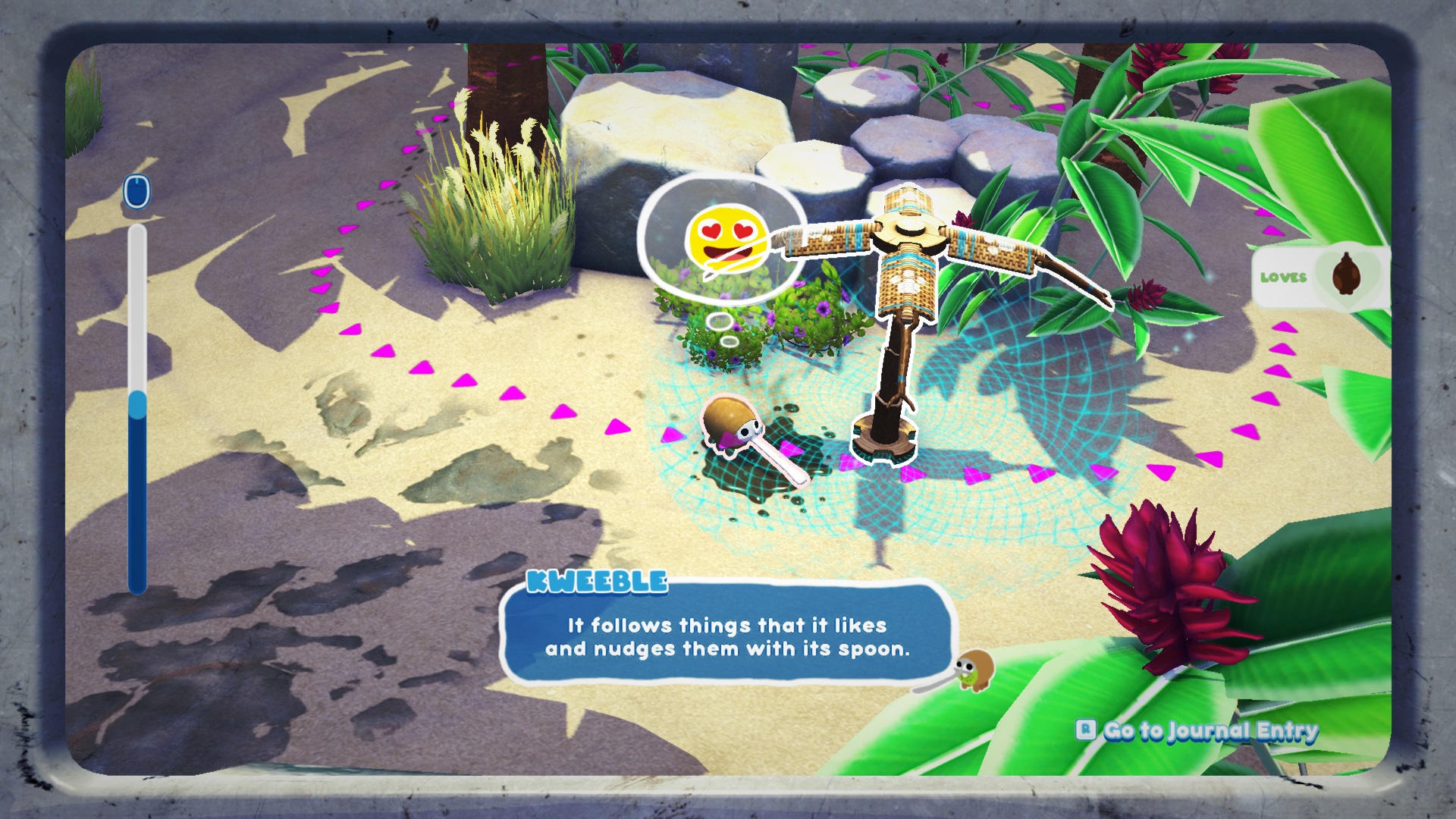 Other gadgets like the grapple and the tripline can be used in tandem with other tools to snag Bugsnax. Each new species is a new puzzle you’ll need to solve. Using your tools, the environment, and knowledge of Bugsnax and their interplay is the key to a successful hunt. The game promotes multiple unique approaches, and offers new strategies in a steady stream. The Big Bopsicle will stun itself if you bait it into charging at a hard obstacle. Additionally, you can exhaust it, causing it to break into two Bopsicles that can be easily scooped up. There was always something new to teach, and I was always ready to learn.