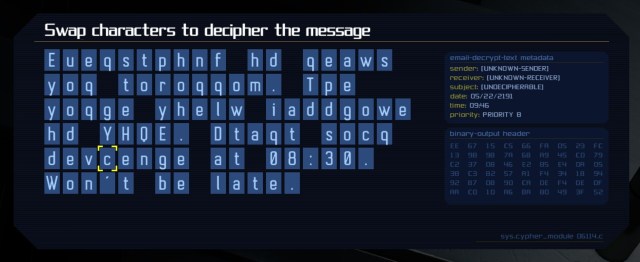 Aside from all that, there’s also a large variety of menu puzzles you’ll need to solve along the way. These include decoding secret messages, identifying correlations and patterns, and some good ‘ole maths. The latter of which I’m awful at. Yet, even I was able to deal with that. The skill level required for many of these isn’t all that high. Those that are a bit more of a challenge also feel quite fun as well. Hats off to the developers on these, even if there are perhaps a few too many menu puzzles that slow down the story’s pacing at times.