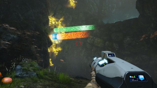 You navigate the alien, often hostile, terrain in your quest to reunite with Claire. Your trusty Nanomatter gun helps you do this. It has multiple functions that allow you to manipulate physics and matter. As you’ve surely concluded by now, the Nanogun is what facilitates the platforming and environmental puzzles along the way. This is where the Portal inspiration is also noticeable. So many puzzle games rely on some kind of crazy sci-fi device to induce changes upon the world. However, you’ll find the functions of the Nanogun are different. You can create a block, bounce pad, gravity attractor, and gravity propeller with it.