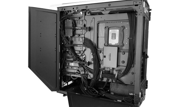 CLX does a great job in showing off the components in the main case compartment. Motherboard cables are tucked away and power cables get the fancy cable combs to keep things neat. Depending on which cables you go with, the results can be very clean. I selected the EVGA PSU that came with black cables. You can also pay for braided cables in other colors. As a note of consideration, think about which cable colors you go with. The service panel side of your case has tempered glass, so you will see things like white cables or SSDs through it. This PC had the black Samsung 860 mounted in the back, so it wasn’t visible through the glass.