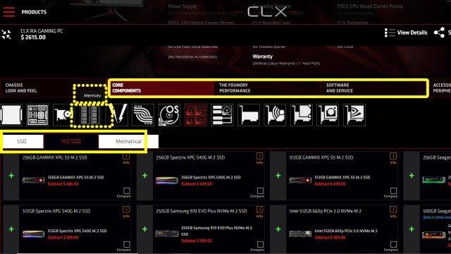 You can also add on all kinds of peripherals and accessories to your order if you want. This all pretty standard fare. Here’s what we configured on the CLX Ra PC in the end:
