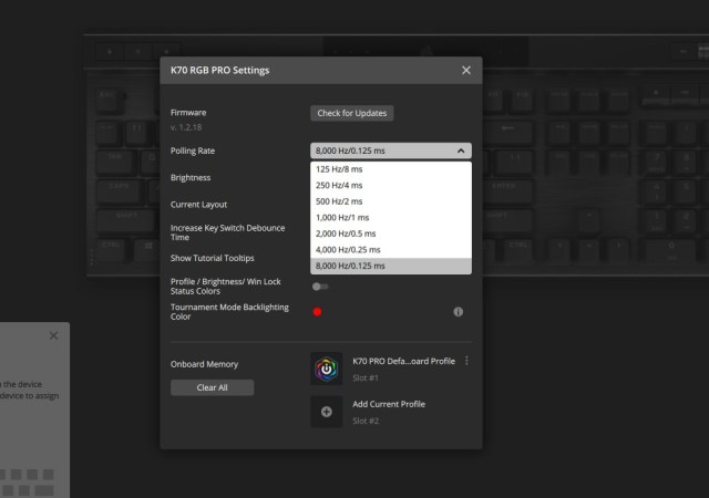 That said, utilizing the AXON Hyper-processing helps with performance in major ways. While it does use significant resources as the set rate within iCUE gets higher, it makes the experience far more enjoyable. When maxed out at 8,000Hz, my response time was as low as 0.125ms. By comparison, most standard gaming keyboards are limited to just 1,000Hz, or a 1ms response time. Having a response time that incredibly low on the Corsair K70 RGB Pro can mean the difference between getting out of harm’s way or dying a painful death in games such as first-person shooters.