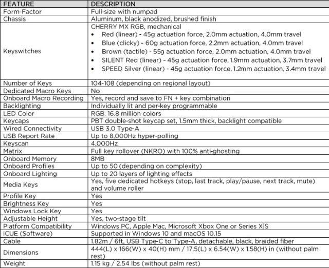 Corsair brings along its proprietary AXON Hyper-processing technology that claims an 8x increase in response time over traditional gaming keyboards. The keyboard advertises 8,000Hz hyper-polling and 4,000Hz key scanning. Other features of the keyboard include a detachable USB Type-C cable, media controls, and 8MB of onboard memory for storage for up to 50 profiles. Depending on your region, you’ll have 104 to 108 total keys, giving you countless options. For RGB, there are 16.8 million colors at your disposal.