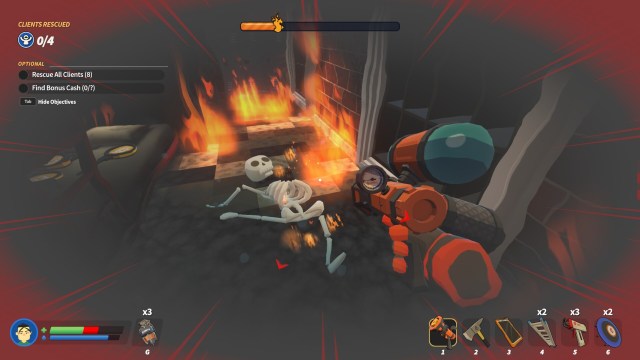 Sometimes, people you need to rescue just fly right through the walls and die for no reason. Occasionally, clients will end up stuck in geometry and you can’t save them. Your character can also die nearly instantly from walking too closely to grease fires or other hazards. One level has a spot where it’s easy to accidentally start a grease fire. If you do, you can’t get into the floor from its main doorway anymore unless you just want to die or get so close to dying that the rest of the fire can easily finish you off.