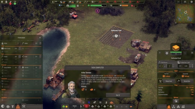 But what you start with is about a dozen adults, half as many children (who will soon mature into useful adults – Endzone: A World Apart has aging in it), and the broken-down camper van that has some resources to keep you going. Obviously, what you want to do first is slap a jetty down at the nearest lake, build a cistern close by, and then assign some of your citizens to be water carriers. With that out of the way, you might want to start thinking about more sophisticated resource chains.