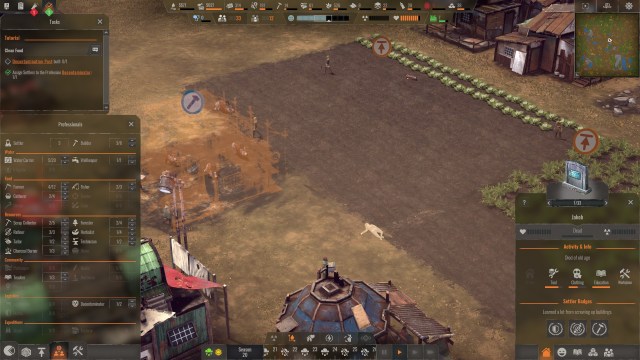 This is where Endzone: A World Apart dares to break away from the usual milieu in that even the populace that isn’t press-ganged into dirt farming can be used in resource extraction. You can set tasks, designating areas where free hands will be used to gather some type of resource (or all of them, that’s an option). This means that you have some leeway when it comes to early resource crunches. Sure, you might not have the scrap to build a scrapyard right now, or maybe your old one was knocked down by a sandstorm or raiders, but don’t worry! It’s not a death spiral as long as there are scrap piles small enough to be picked through by hand.