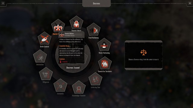 That’s certainly something I don’t remember seeing in Frostpunk. But you know what I do recall? The political management of the settlement via edicts and the two different paths they can take you. In Endzone: A World Apart, you can declare edicts once you build a forum, but they only last some time and aren’t as dramatically expressed. It’s also a place where you can pick and choose missions for your citizens to accept. Without a forum, you’ll only get missions at plot-related or crisis-mandated points. It’s funny, solving the issue of water shortage and being rewarded with more water. Wonder where they kept that – and why did they not share.