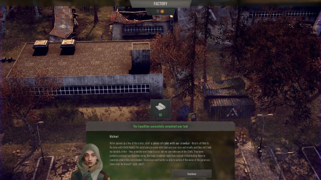 Expeditions are fun, as they can have many and varied requirements to pull off successfully like “have young people aboard” or “everyone should wear radsuits.” You can ignore these, but then your odds of getting the best result in the short, nearly text adventure-esque quests decreases significantly. Another cool thing is that expeditions aren’t one and done: you can return to collect any loot left behind or to complete challenges you weren’t ready for the first time around.