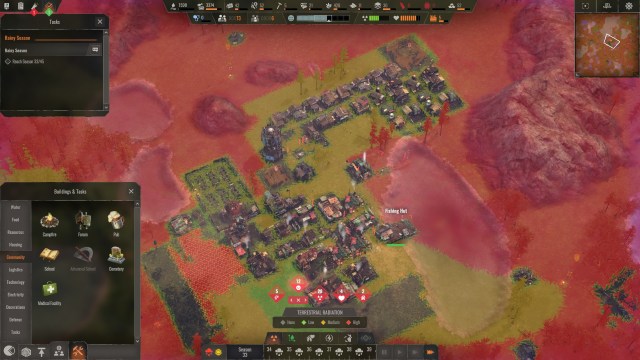 I bet you’d like to know what an Endzone is. Well, it’s something you won’t deal with too often for a game named after it. An Endzone is an underground bunker housing survivors of the collapse – a Vault, if you will. However, nobody wants to stay cooped up and breathing refiltered farts for too long. The survivors mosey out while the world is still plagued by radioactive rain and devastating sandstorms. As the genre-standard disembodied mayor in the sky, it’s up to you to keep a settlement running despite these natural-ish disasters.