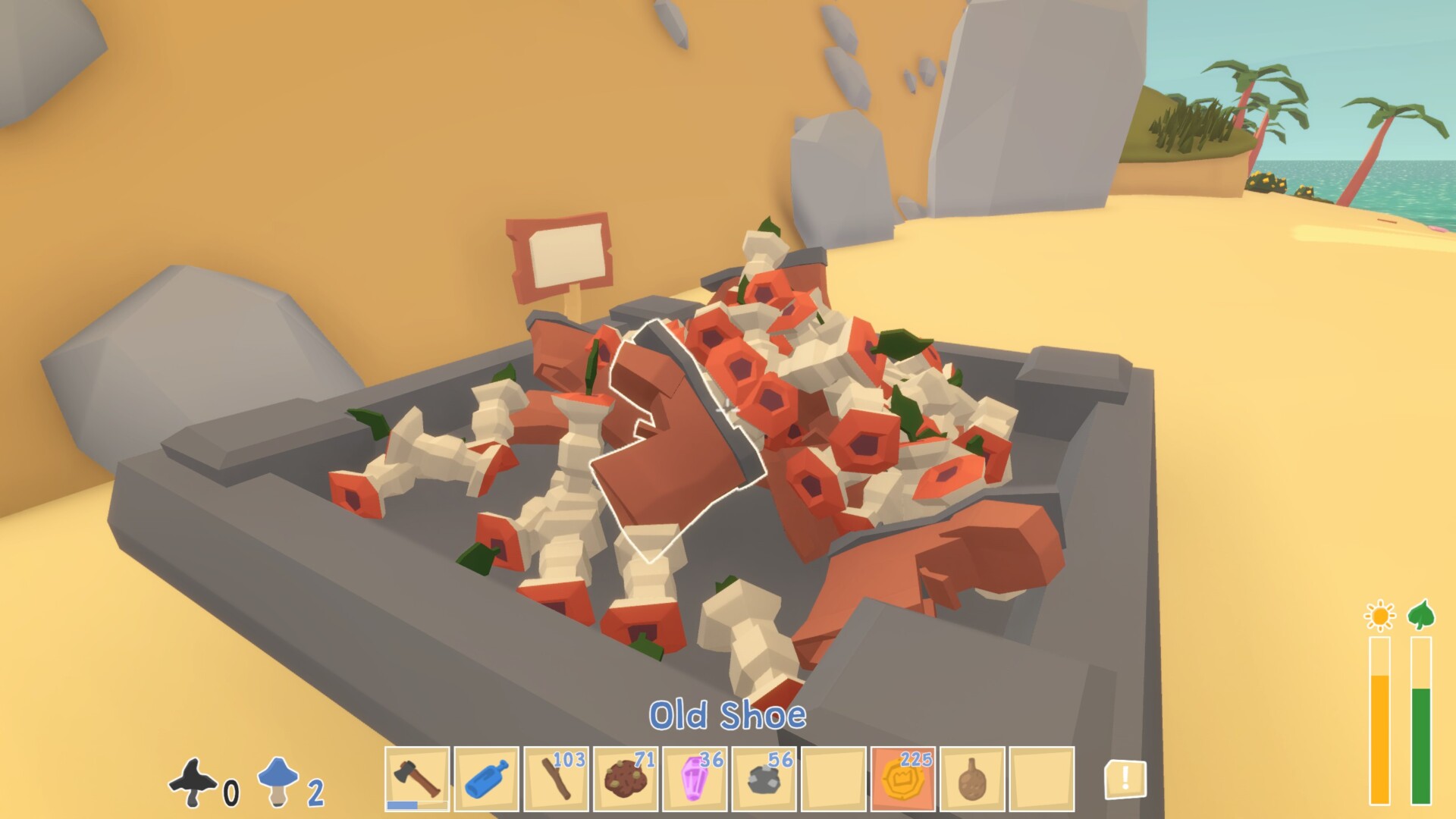There are treasure chests to find, and gnomes to put around your home for an optional quest. Chests mostly have money in them, but money is fairly useless in Gardenia, and there isn’t much to spend it on. Completing the gnome quest also has a very disappointing reward. You can actually craft the reward yourself, so it’s not even unique. Speaking of crafting, the game has an interesting approach to that as well. There are grey pallets around the island that you’ll have to place ingredients on. Once you have most of what you need, you drop a pink magic crystal on top, and poof, the item is crafted.
