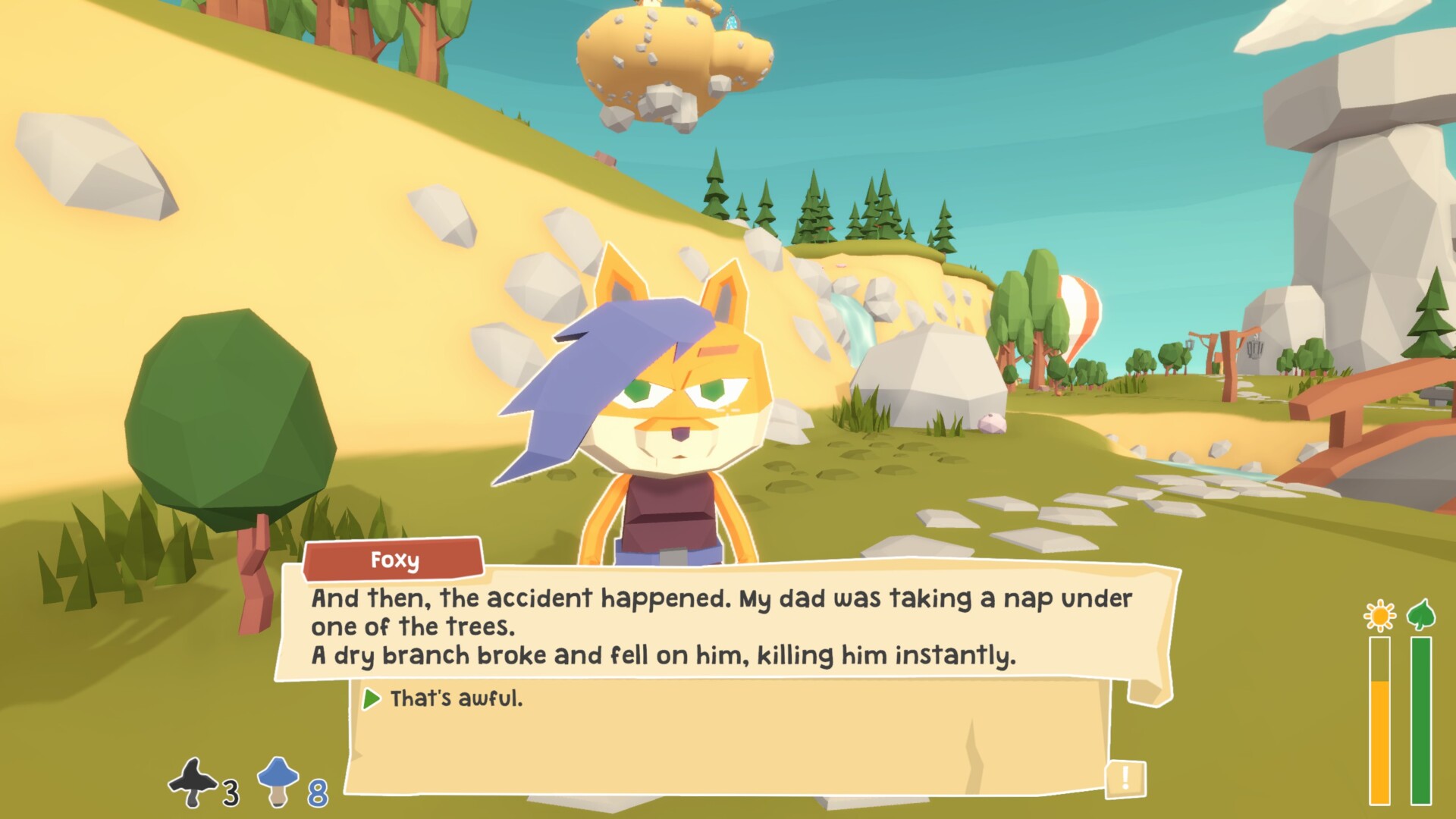 Honestly, this game is pretty funny. The dialogue and characters are irreverent and just kind of doofy in a way that had me guffawing. One of the characters is a lady bear with an anger problem. When you first meet her, she beats the crap out of you for no reason. Also, her name is Kimbearly. You’ll meet other characters, such as Foxy, a fox that used to be a secret agent, and Mr. C., a lizard that is definitely not named after the Twin Peaks character.