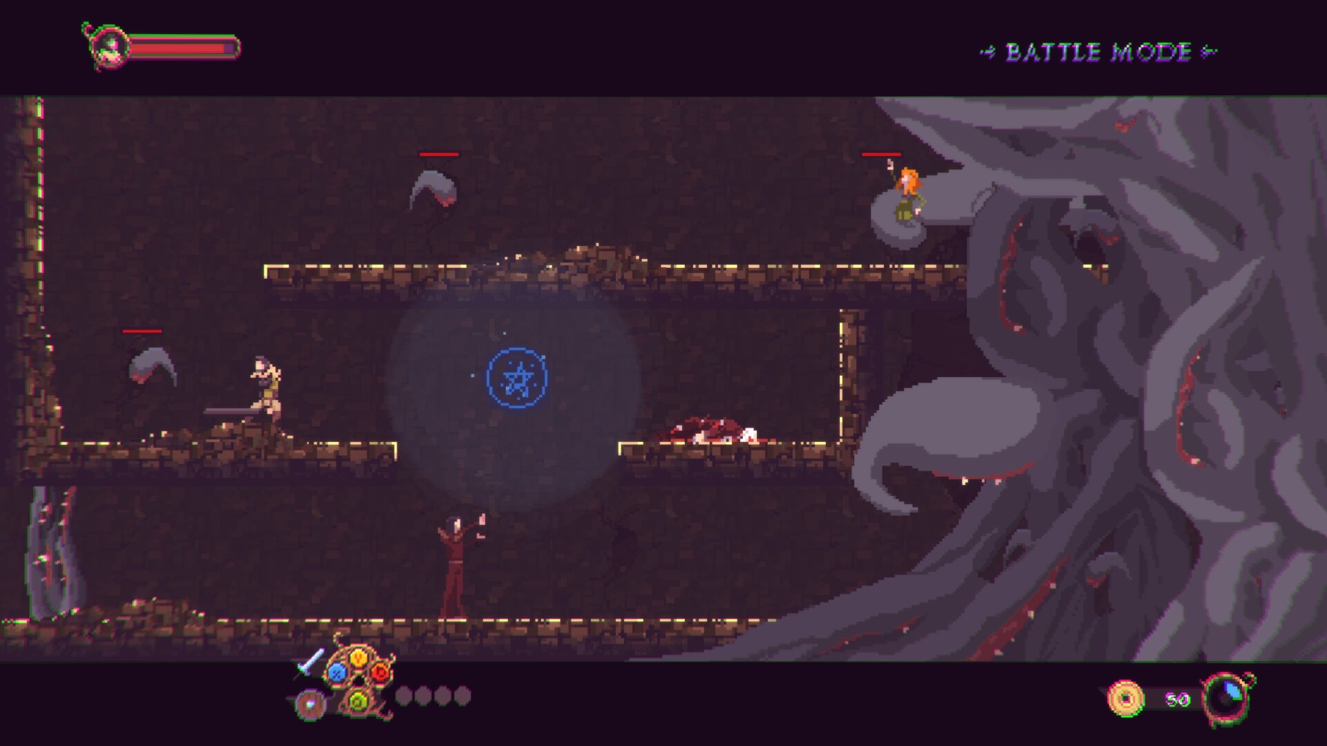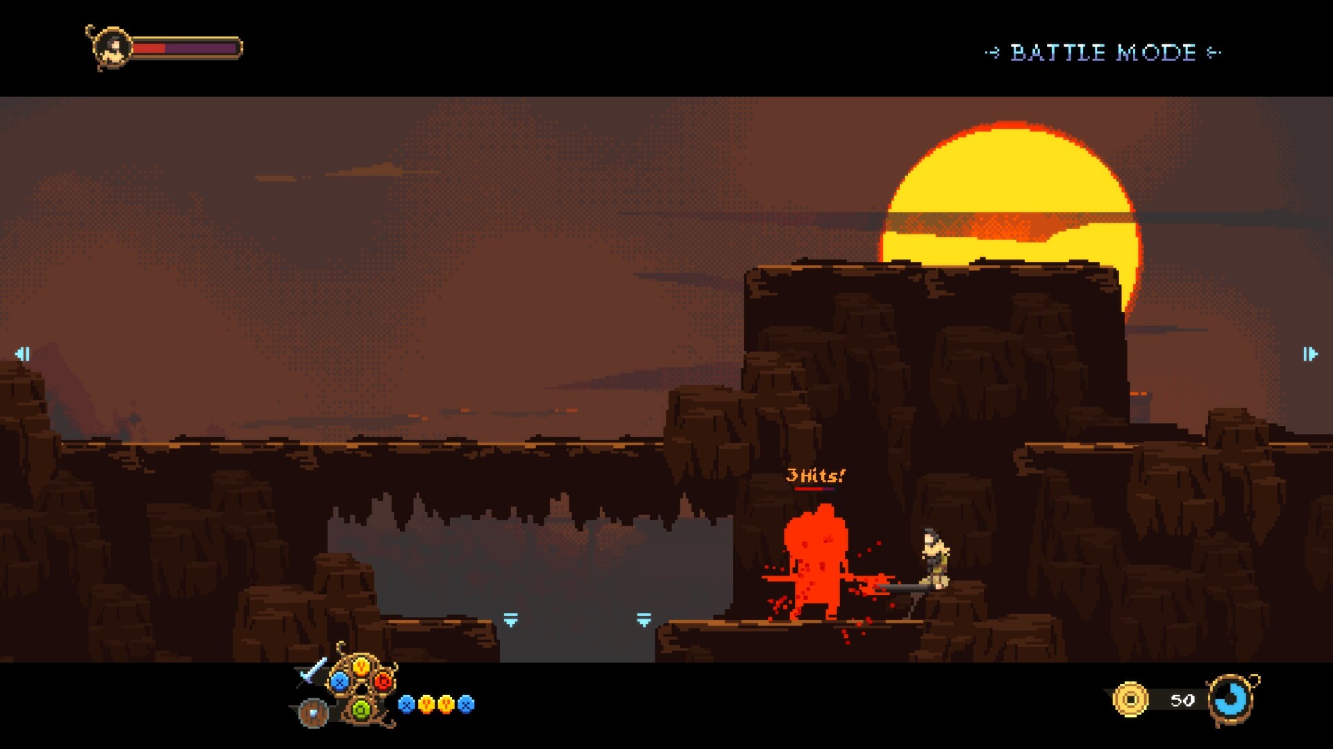 Enemies in Guild of Darksteel walk left and right while mostly sticking to a small section. When you come close enough to one, you’ll enter battle mode. Once in battle mode, you can only block and attack. At first, I found this rather enchanting and a bit unique. Enemies wildly telegraph their attacks and blocking at the right time will negate any damage. Enemies can also block your strikes as well. You attack by using a handful of combos that make use of three buttons that need to be pressed in specific orders. Most of these combos aren’t all that useful, though, and I found myself almost exclusively using two by the game’s midpoint.