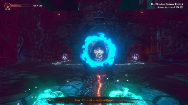 The mechanics of Into the Pit are actually impressively complex, at least at first. There are five main dungeon types, each with unique geometry and enemies. There are 15 normal dungeons and one final one, which is where the alderman awaits. To get into each dungeon, you need to place one or two keystones into the altar in front of the pit. Any of the keystones can be placed individually to venture into that specific biome. But, combining any two, save for the final one, will result in dungeons that are a mixture of two biomes. It’s quite clever and I don’t think I’ve seen its like in other games.