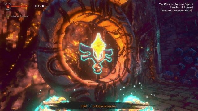 You can equip six support runes with varying effects. You start with a few default ones and can buy more. You also need to buy five of the six keys. They’re purchased with motes that you don’t lose when you leave the pit. Wealth motes are like money and fire motes allow you to forge keys. Then there are insight motes, which you’ll use to upgrade support runes up to level three. The thing is, some of the support runes are so useful that they’re broken. You can easily use them to heal every time you grab a mote or destroy a keystone. This makes failing pretty difficult.