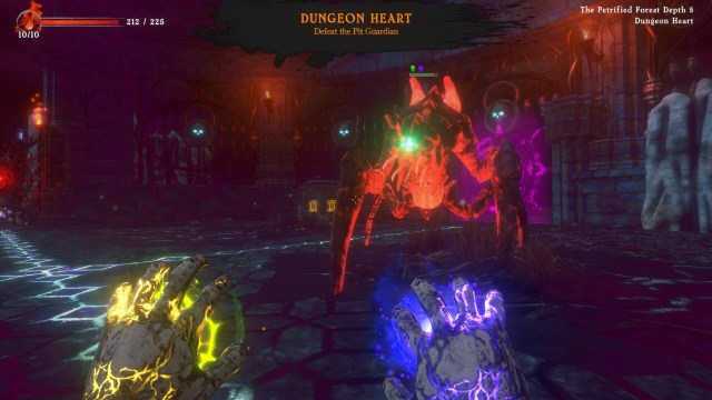 When you first enter a dungeon, you’ll get to choose an attack spell for each hand, plus your first upgrade. There aren’t a great many attack spells and a lot of them feel interchangeable. It’s a good idea to have a high fire-rate spell and a long-range one though. Upgrades come in a larger variety and can grant you extra damage, the ability to put afflictions on enemies, extra health, damage reductions, and more.