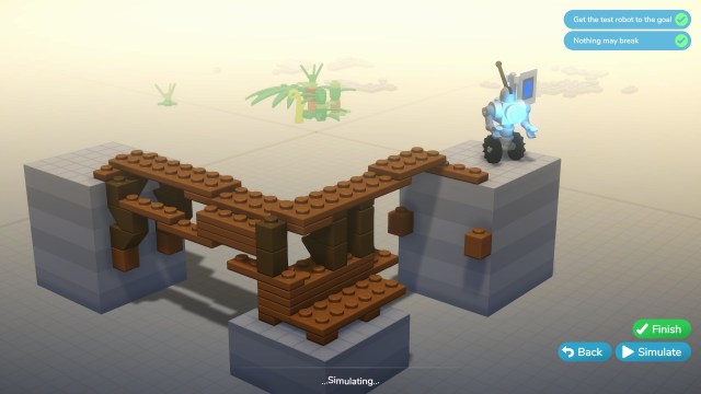 As you progress through the Story, you’ll continue to encounter obstacles that you can only pass by building the appropriate design. The rigidity of your design has to be verified before you can proceed. A robot will simulate your character using the design, and if it passes, your blocks will be placed into the level, allowing you to carry on with the Story.