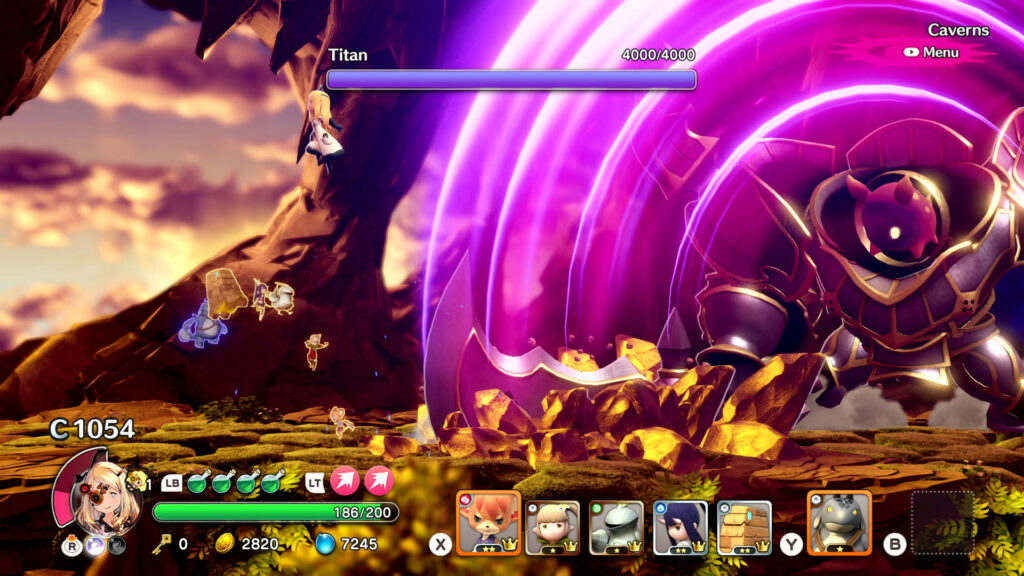 You have an inventory of Lilliputs, and a “lineup” you can change at any time. This lineup actually informs your attacks, which simply have you mashing square a few times. But what those mashes actually do can vary wildly, from quick little slashes to big, meaty swings and all kinds of projectile nonsense. You also get two slots for Skills, which provide a different attack from whichever creature occupies those slots, usable on a cooldown.