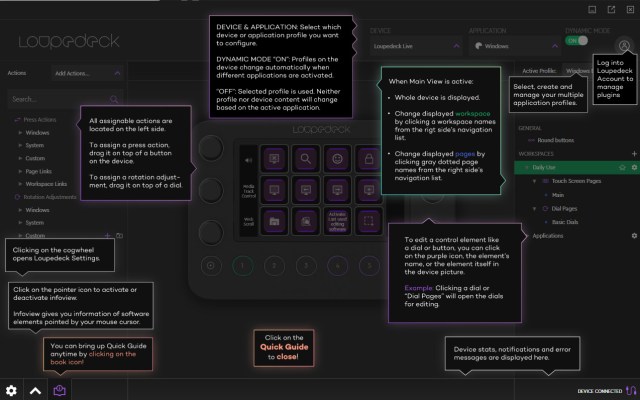 When you load up the Loupedeck software, an on-screen guide greets you to show you around. You’ll see your device in the center with available actions on the left and workspaces on the right. Your workspace is your layout of custom tasks set using actions. Each workspace can have multiple pages that you can bounce to whenever you want.