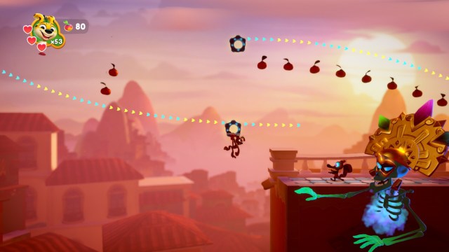 What follows is roughly two hours of standard 2D platforming that’s heavily inspired by Donkey Kong Country. There are three worlds with about 25 main levels altogether. Each non-boss main level has a portal to a bonus stage, plus five feathers to collect, which are used to unlock Marsupilami: Hoobadventure‘s three extra stages. Beating a level unlocks its time trial variant and each world has a single “boss stage” where you chase the skeleton guy. Only the last of these resembles a boss battle, however. Once you complete the game, nothing unlocks.