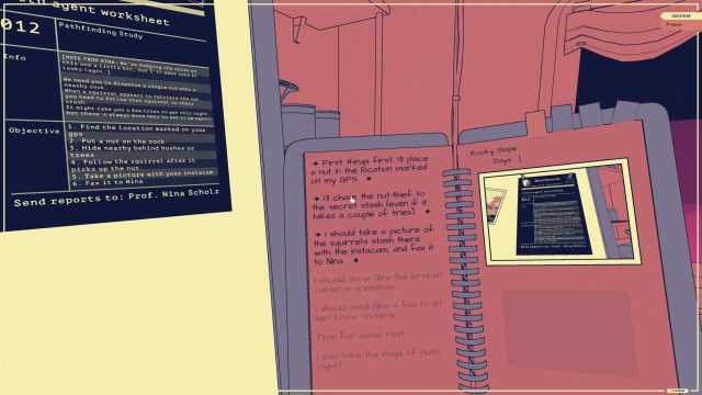 Leading the study remotely is another fellow squirrel aficionado, Dr. Nina Scholz. She is well aware of the challenges facing you, as she conducted similar studies in person, over twenty years ago. Nowadays, Nina is still involved in these scientific pursuits, only now she gets to direct all of the action from unknown distances away, via phone and, of all things, FAX machine. Yes, you did just read that correctly. A game, in the year of our Lord 2021, actually utilizes a FAX machine as a crucial gameplay mechanic. God help us all.
