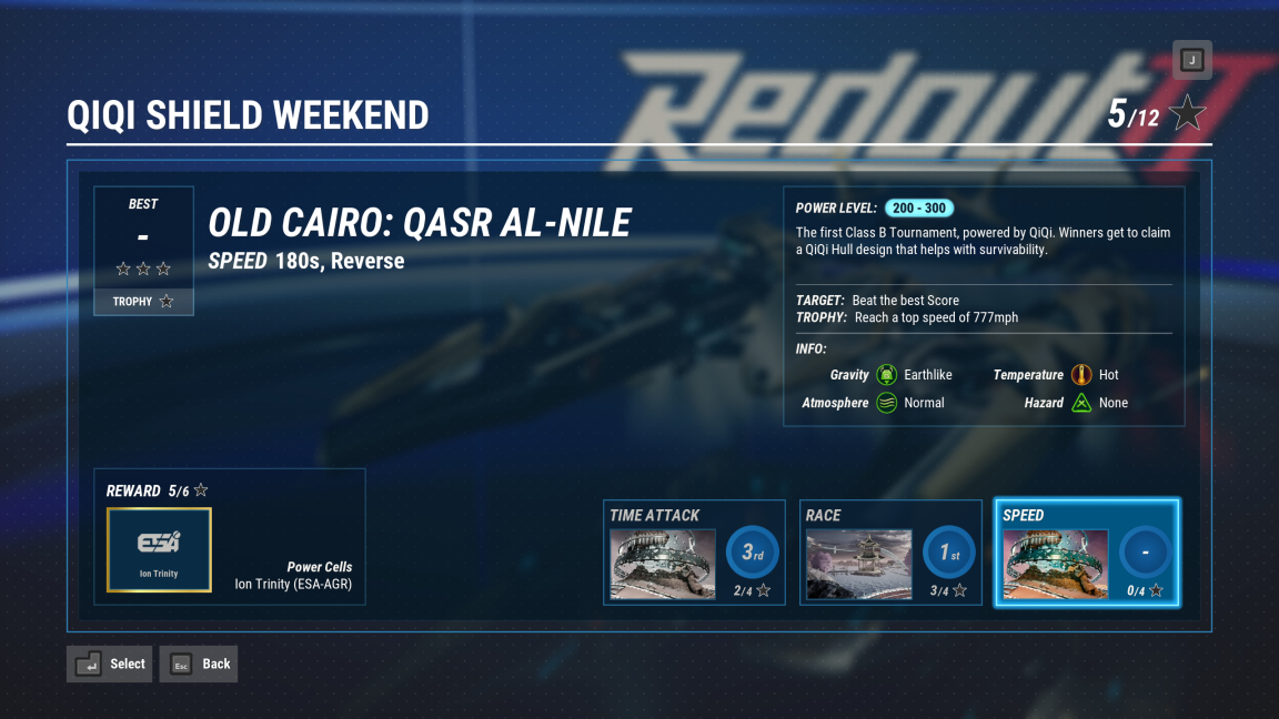 That leaves Career, which is where you’ll spend most of your time playing Redout 2 until multiplayer improves. Career starts you off in the Trials division and then has you progress through the B League, A League, S League, and finally the SRRL Invitational. In order to progress, you have to pass each tier’s Promotion Event. This is done by earning enough stars in other events, with stars being given for finishing first, second, and third, plus an additional star for successfully completing the trophy goal. Trophy goals are secondary targets that vary from things like winning by a set margin or only respawning so many times.