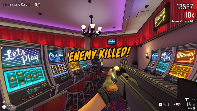 Unfortunately, certain aspects of RICO: London are notably worse than its predecessor. I think it’s supposed to be more of a score-attack spin-off than a sequel, which fits, but it’s not entirely clear. Enemies react to damage less believably this time (not that they were that great about it before), and the amount of damage they take has gone up. It pretty much always takes two headshots to drop a normal enemy, as opposed to the one required last time. When your bullets hit, enemy reactions are less impactful, and the blood effects aren’t as impressive. Even worse, the game is missing some of the helpful features that you’ll find in its older brother. You also don’t seem to be able to rebind keys, which is a bit weird.