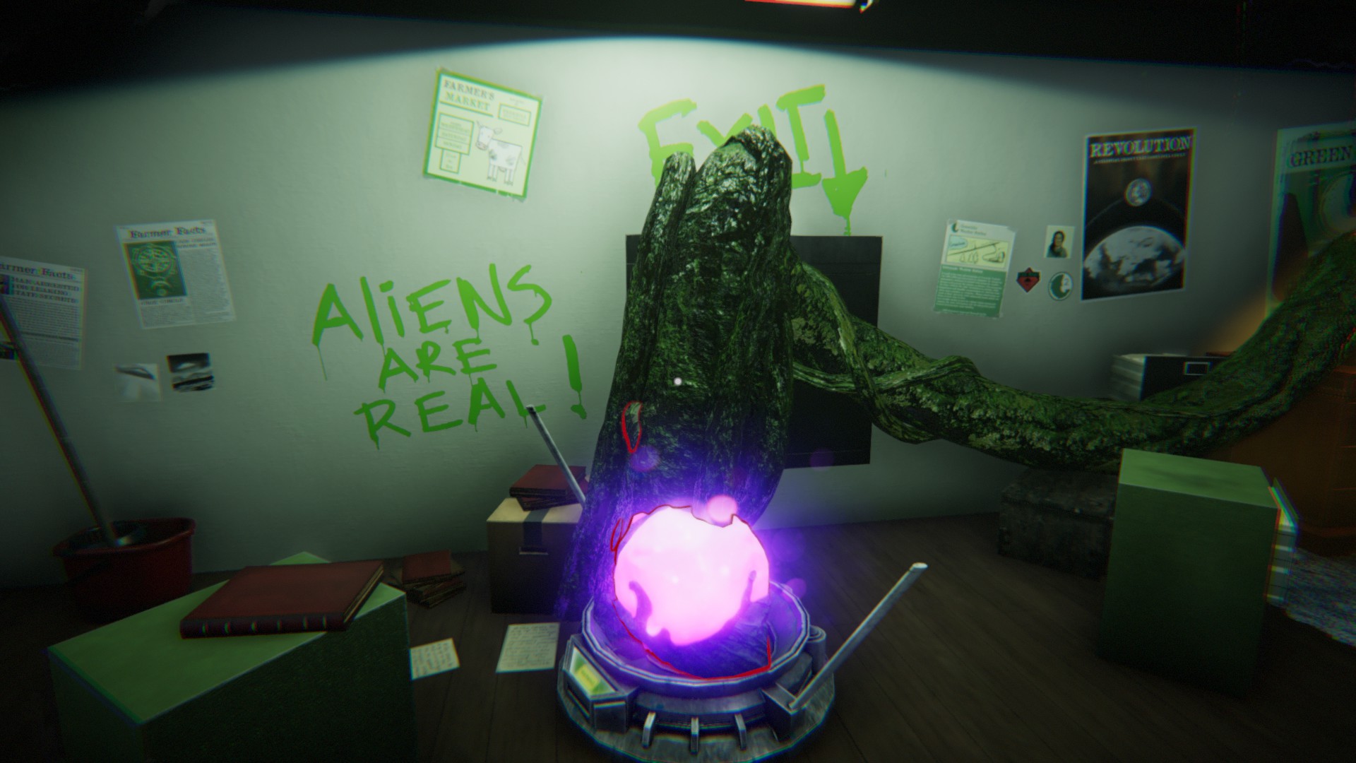 Speaking of which, Johnathan can walk, run, crouch, and use his flashlight. Sanity of Morris is in first person, and it’s one of those games where it’s hard to tell if you’re running or not. The flashlight is the most important thing here, as Johnathan’s entire vision gets clouded in shadow bit by bit if you leave it off too long. There’s never any explanation given for this. Additionally, objects and items that can be collected or interacted with glow red, but only when the flashlight is shined on them. This is often the case even when the area is clearly lit. The flashlight’s beam can also be focused, which is necessary for activating certain alien devices. Once again, I have no clue why.