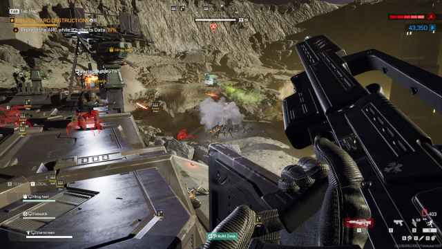 Starship Troopers: Extermination doesn’t lean on the parody aspect of the film but instead plays it straight. 16 players are dropped on a map to drain the planet’s resources by constructing refineries and killing as many bugs as possible. The aesthetics, dialogue, and general presentation draw heavily from the first film, and it’s a fairly faithful experience on that front.