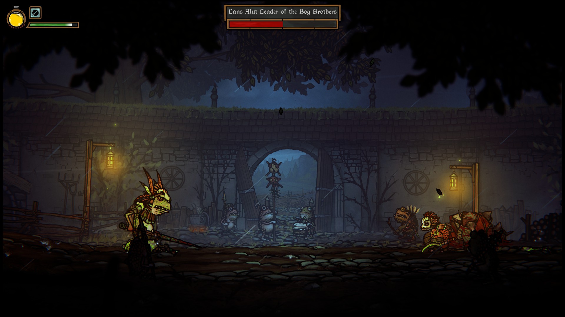 So, that’s what you do in Tails of Iron. In this charming side-scroller, you run around and beat up frogs, grubs, mozies (mosquitoes), and a few other similar enemies. To keep you in good health, you can take a swig from your bug juice flask (Redgi likes it with chunks). And if you die, you start over from the last save point, which takes the form of various benches with an attached blue lantern. No fancy respawn mechanics here — they just act like regular save points.