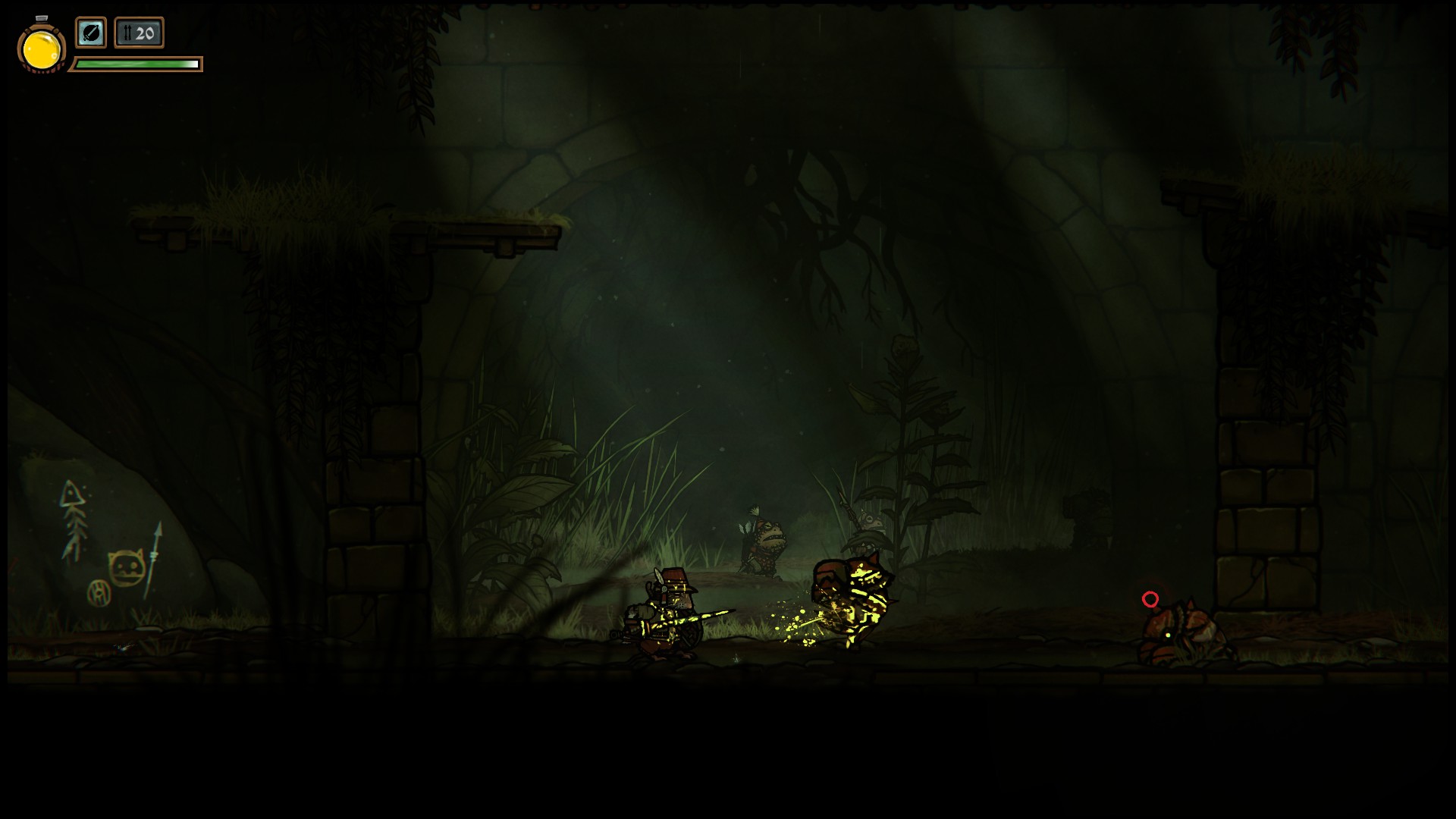 When it comes to defense, you’ll have blocking (available to either melee weapon) and dodging as well as dodge-rolling. In practice, Tails of Iron favors dodging over blocking. Sure, any regular attack (no effect), ranged (white spikes around the enemy), or special melee (yellow lightning bolts) can be blocked — and block parrying a special will lay the enemy flat for a time. However, bosses will have far more in the way of unblockable (red stripes) and undodgeable (red circle) attacks. Those are the real killer.