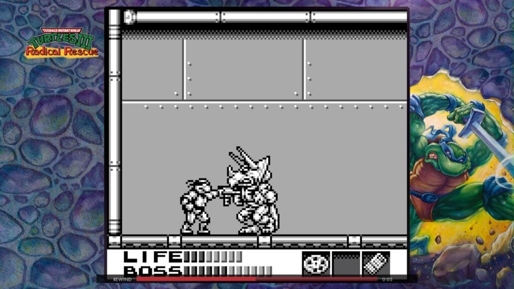 But fear not challenge-averse gamers, as The Cowabunga Collection is not unforgiving in its difficulty thanks to the accessibility options provided by Digital Eclipse. Through using some helpful features, anyone, of all gaming skill sets, who want to experience the next-gen nostalgia can do so without fear of embarrassing, repeated failure. The most notable of the accessibility tools at gamers’ disposal is the rewind function, which allows players to reverse time a few seconds back, giving a mulligan for when you inevitably get hit by enemies, jump into fire, run into lasers, fall into lava, are impaled by spikes, flattened by cars, blown up by bombs, or when you just want to redo a punch to try a cooler move combo. Also, in the case of the many arcade-style games within the collection, the rewind function is not even necessary, as at the press of a button you can add lives to your playthrough at your leisure without any actual monetary cost. Thanks to The Cowabunga Collection, arcade games that once siphoned the allowances from young ’80s and ’90s TMNT gamers can now be enjoyed without the loss of quarters, from the comfort of home.