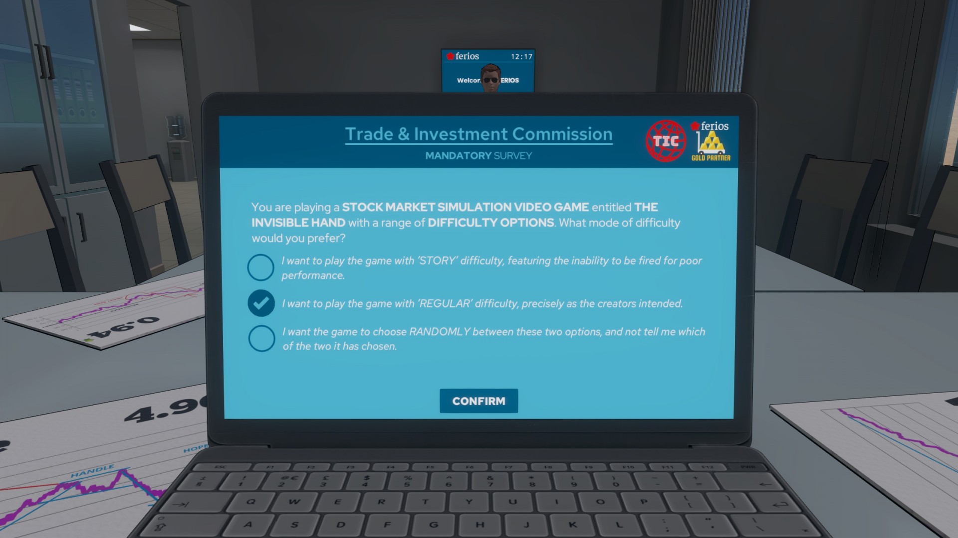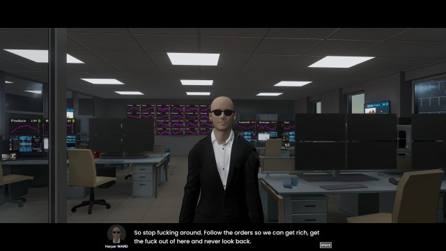 The Invisible Hand begins with your unnamed character being hired by Ferios, an elite financial company. You don’t have relevant experience, but your relative knows a guy that knows a guy. Before long, you’re neck-deep in company politics while you sink deeper into the ethics-free mire of big money. The plot itself mostly concerns a watchdog group keeping tabs on Ferios, while you yourself use illicit tools to get a leg up on the competition. One of these is Geistnet, a dark web resource that has the latest scoop on insider information.