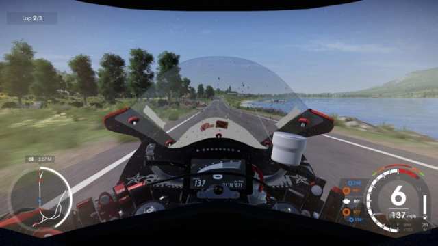 I played mostly in a first-person view. You even have the option of driving with a helmet obscuring some of your vision, which I found to be the most fun way to play. However, the sound design itself seems to fall short of achieving a total sense of immersion. The best racing games achieve a strong sense of immersion for the player through a mix of physics and sound design.