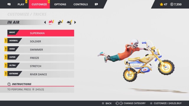 Every special move is tied to where the bike is at any given time. If it’s in the air, there are a certain collection of activities that can be performed, initiated using a series of unique button combinations. The same can be said for when the vehicle is either in a wheelie, stoppie, or stationary position as well. Unfortunately, except for the tricks performed aerially, the remaining trio of positions feel unnatural and awkward to try and pull off. Granted, this might improve slightly over time, but I’ve actually cleared every stage and still feel weird trying to complete a majority of the moves consistently.
