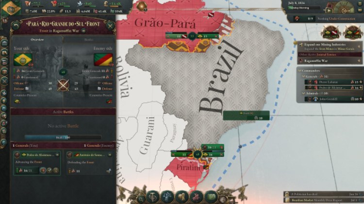 Eventually, I decided to play as Brazil. At the beginning of the campaign, the nation is engaged in the Ragamuffin War and another conflict against Grão Pará. Warfare is, perhaps, one of the strangest changes I’ve seen in the game. If other titles had you selecting multiple units and advancing them one by one to capture provinces, then Victoria 3 is relies primarily on automation and streamlining.