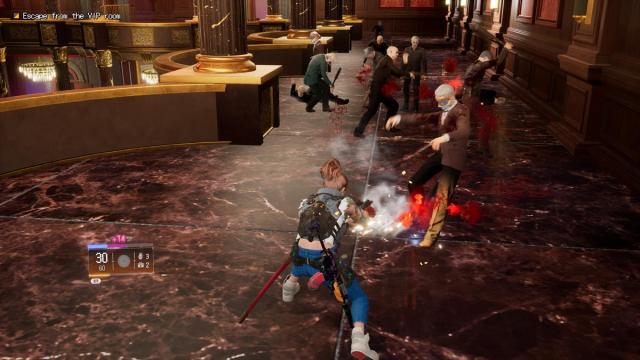 But nobody plays hyper-violent action games for the story! When I first started Wanted: Dead, enemies lined up to shoot at me, requiring me to seek cover. Stone takes cover automatically. She’s equipped with a rifle, pistol, and katana by default, leading me to assume the game was primarily a cover-based third-person shooter. But the shooting is miserable, and the rifle has barely any ammo. The pistol also can’t be aimed because why would you want to aim a fucking firearm? It didn’t take long to figure out that there’s literally no reason to play the game like a third-person shooter, because Stone can just roll around hitting any ranged enemies with her sword until they die.