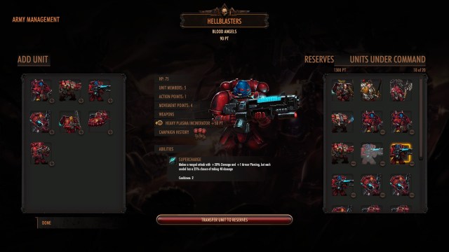 The other bit requires a bit more of a Warhammer 40,000 nerd touch, but bear with me. The ranged units are absolutely incapable of melee, to the point where they can’t even initiate it. Typical TBS stuff, to be sure, but we’re talking about Space Marines and specifically the Blood Angels, here. Each Space Marine is a superhuman killing machine, equally adept at shooting as well as punching. But if a squad of Termagants is to charge some Intercessors, the Marine counter attacks would be mere slaps.