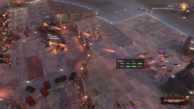 So, that’s the story you’ll explore in the single-player campaign of Warhammer 40,000: Battlesector. On the more mechanical side of things, it’s a turn-based game where you control up to 20 units at a time. The unit stats go pretty deep, and each member of a squad has their own HP track. All units have separate movement and action point pools, plus a Momentum pool. Though, outside of heroes, units have only a single AP.