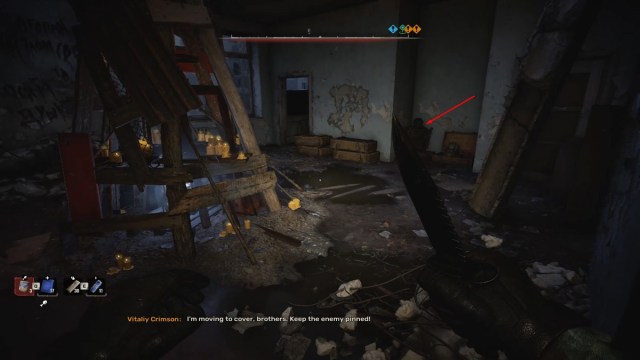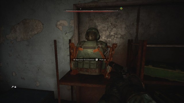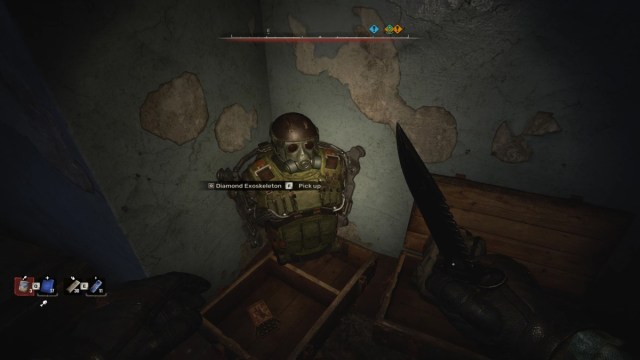 Once it’s marked, enter the building through the courtyard and take the stairs to the second floor. After navigating through a few doors, you will come across a PSI Emitter barricaded by wooden contraptions. To the right of the emitter, you will find the Diamond Exoskeleton.