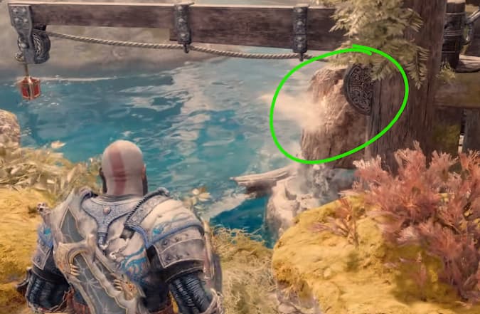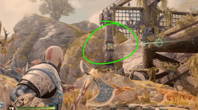 Head to the North side of Alberich Island to find the Nornir chest. You’ll need to hit three seals to unlock it. For the first, turn around towards the pier, and you’ll see a column marked with the light runic green. Shoot it or throw your axe.