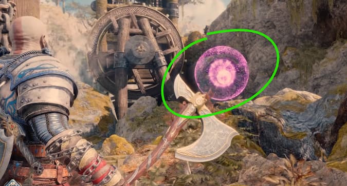 Head across the bridge and turn left, where you’ll see some turquoise shale. Destroy it and run through the new passage. Straight ahead, you’ll see one of Odin’s pale green Ravens. Line up your shot and shoot it out of the sky.