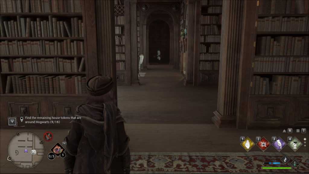 We’ll head right into the library itself for the next one, starting at the Library Floo Flame. When you reach the Floo Flame, go right toward the tables of students studying and look toward the bookshelves. The Daedalian Key is in the center of the entranceway between the bookshelves. To find the House Cabinet, head back toward the Floo Flames and turn right until you see it on your left.
