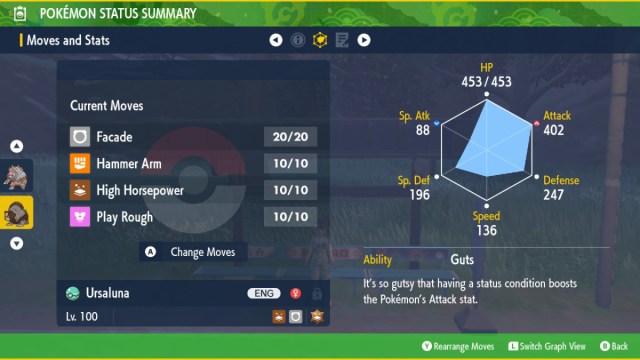 Regular Ursaluna has three possible Abilities. The first is Guts, its most commonly used Ability. Guts increases a Pokémon’s Attack stat by 50% if it’s suffering from a status condition. It also allows the Pokémon to ignore the Attack penalty from a Burn, making the Flame Orb a fantastic held item to activate the Ability. Most regular Ursaluna use Guts and Flame Orb along with the move Facade to dish out massive damage.