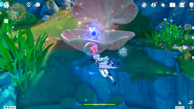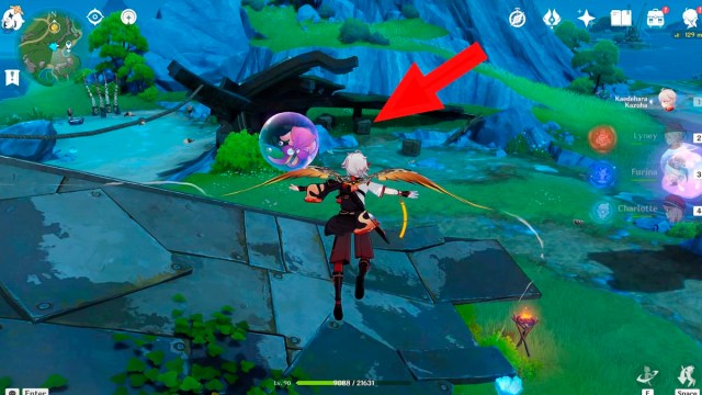 You’ll find many Hydro devices and a blue lamp, with a different machine ready for installing Hydrograna at the top of a small cliff. To make this easier, use a Hydro character to activate the machine directly, then hit the blue lamp to make the Hydro devices move. Once activated, the chest with the branch spawns next to them.