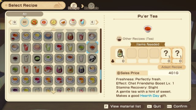 Cafe Madeleine is the earliest way to unlock some basic recipes. Her offerings start with the most basic foods, but gradually offer more when you upgrade your town’s Bazaar Rank. Cafe Madeleine also offers seasonal teas, so be sure to pick them up when they are in season.