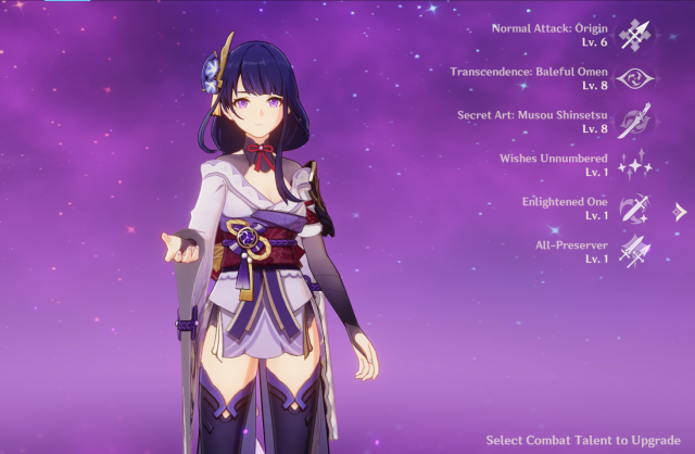 Raiden’s Talents are pretty straightforward, all she needs are the Talent Type Light, which can be found at the Violet Garden. Obviously, because it’s the only domain in Inazuma that hands out talent materials. Below is the chart, you’ll see the exact number of how many you’ll need for each branch of her Normal Attack, Skill, and Burst. For Raiden, it’s most important to level up her Burst and then her Skill, since that is going to be her primary source of attack and damage. If you’ve been waiting for her for a long time then, by all means, crown her Normal Attack. For players who like to save a little bit on resources, you can just get her Normal Attack Branch to Level Six and she’ll be perfectly fine.