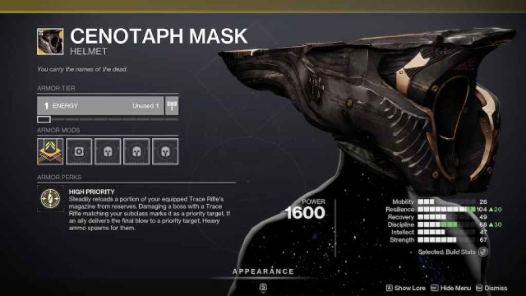 Finally we have the best looking new Exotic (fight me): the Cenotaph Mask for Warlocks. This is a pretty whacky support Exotic that reloads Trace Rifles and marks priority targets by damaging bosses using a Trace Rifle matching your Subclass. When allies get the final blow on a marked target, they get a Heavy ammo drop.