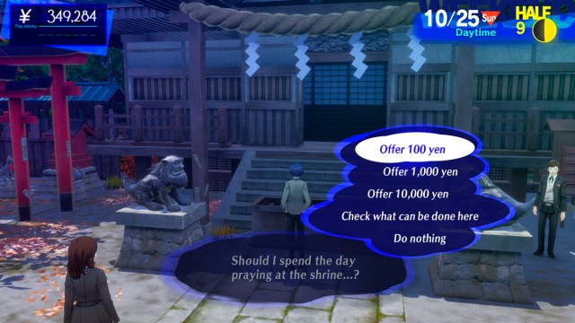 Offering some money to the temple can get you insanely great results, too. Still, since it consumes your afternoon time, this is usually best used for increasing any remaining Social Links. The Academics boost is proportional to how much you spend, but there’s also a random factor to it, so feel free to reset if you don’t get enough points.