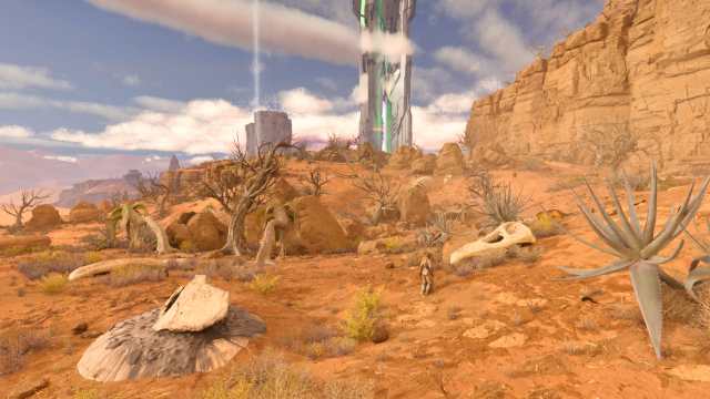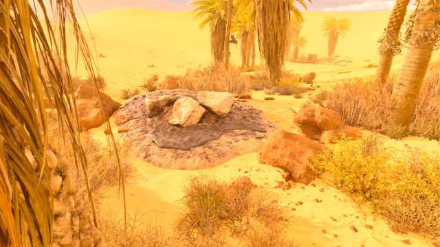 The second set of coordinates will take you into the mountains, to the northeast. Here, you’ll find yourself on red soil and surrounded by bones. Unfortunately, it’s a little harder to find this oil vein spot. But the green tower in the distance and the t-rex skull pointing at it can help you pin it down.