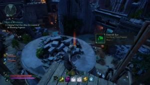 The Emerald Eye is located at Shark’s Teeth in northeastern Shatterscarp. The center of the location will have a Party Camp. Standing next to the large Adra at the Party Camp, look at the southern path to see a large tower of scaffolding. Climb yup the scaffolding and the Emerald Eye piece will be sitting at the top.